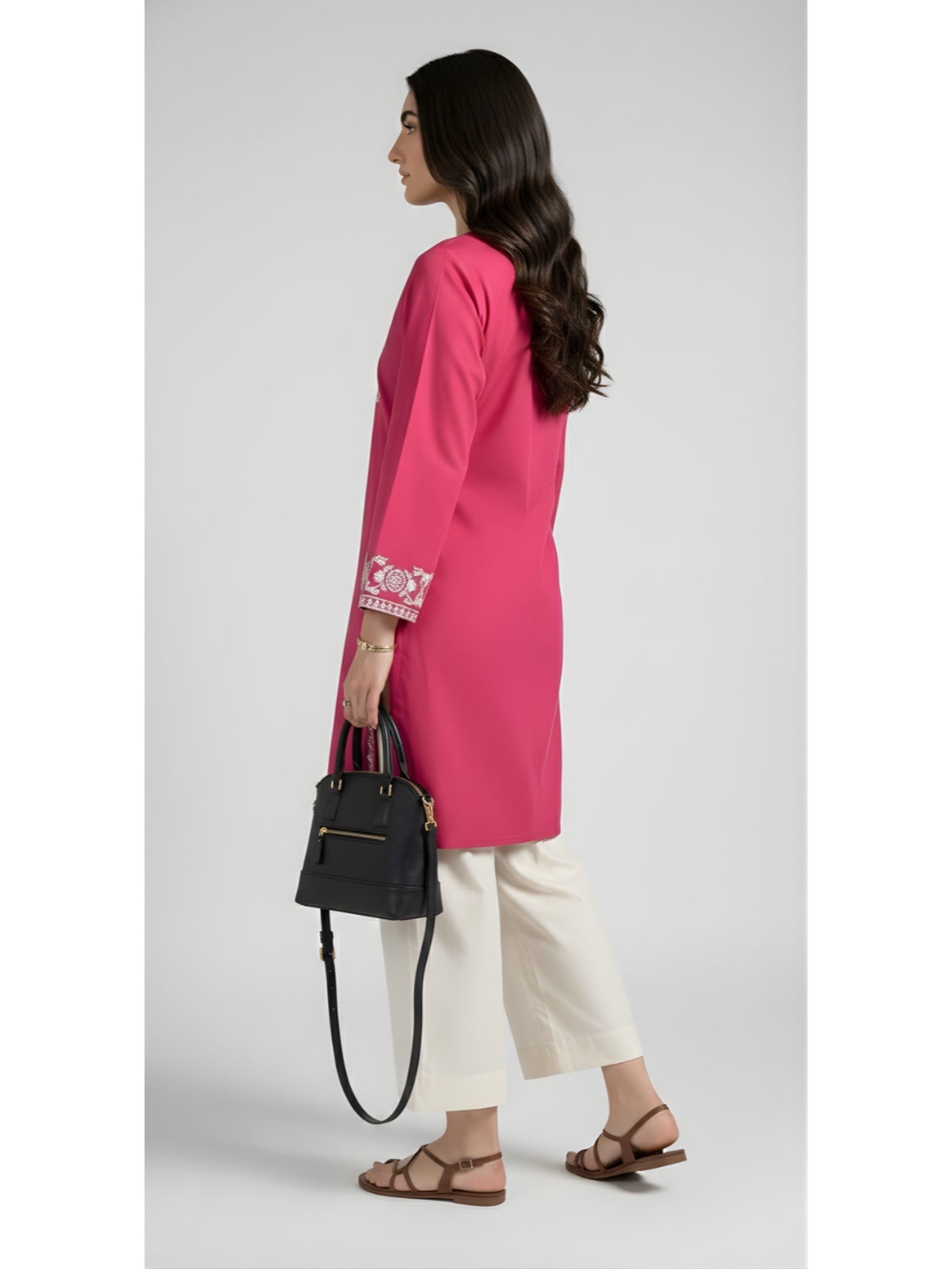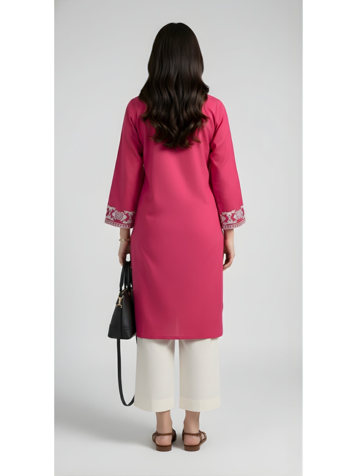 Elevate your everyday ethnic wardrobe with this elegant pink cotton kurti, designed for comfort and timeless style. Crafted from breathable cotton fabric, the kurti features intricate white embroidery on the neckline, sleeve cuffs, and hem, adding a refined handcrafted touch.